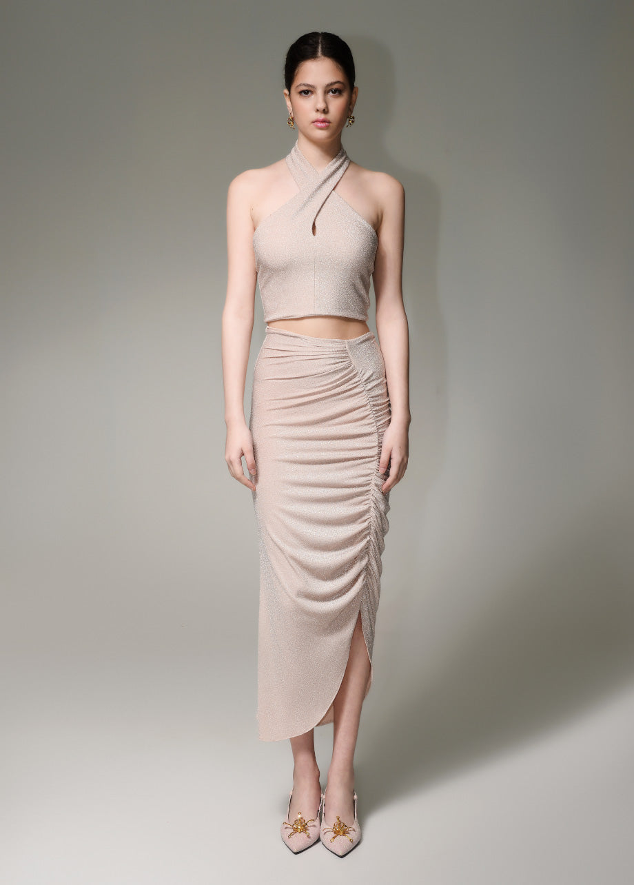A shimmering champagne skirt with side ruching and an asymmetrical hem, perfect for elegant evenings.