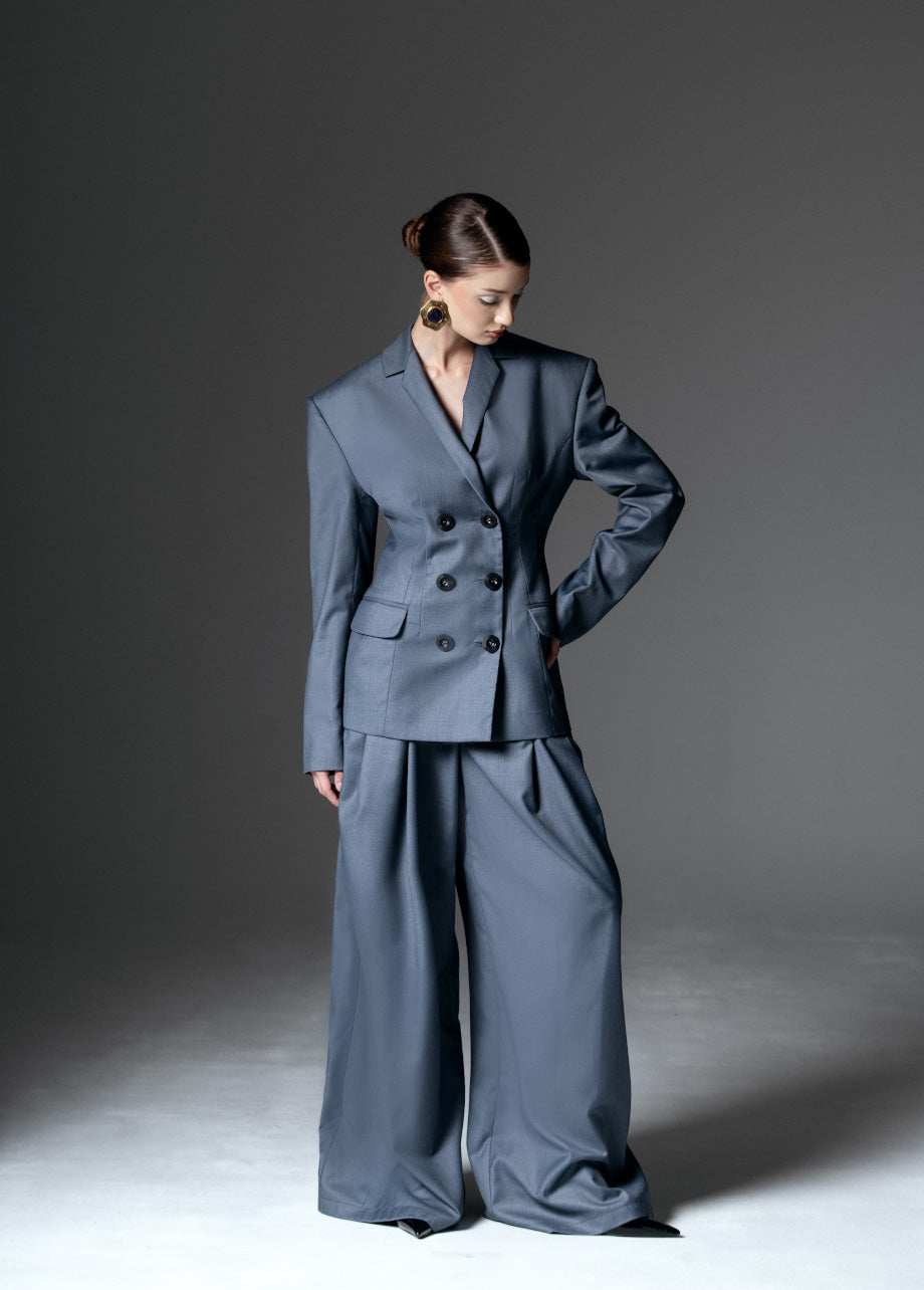 Wide-leg pants in a coordinating charcoal shade, featuring a high-waisted design and a flowing, fluid silhouette. These pants offer a flattering, lengthening effect that adds a touch of sophistication to any outfit.