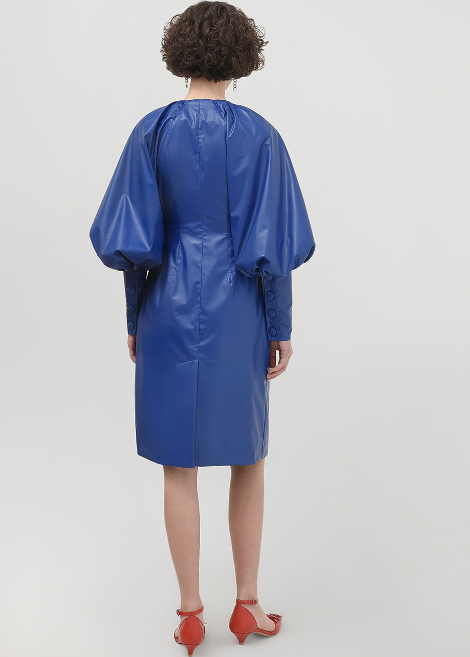 Blue faux leather dress with bold balloon sleeves, a rounded neckline, curved seams, and side slits for a modern, standout look.